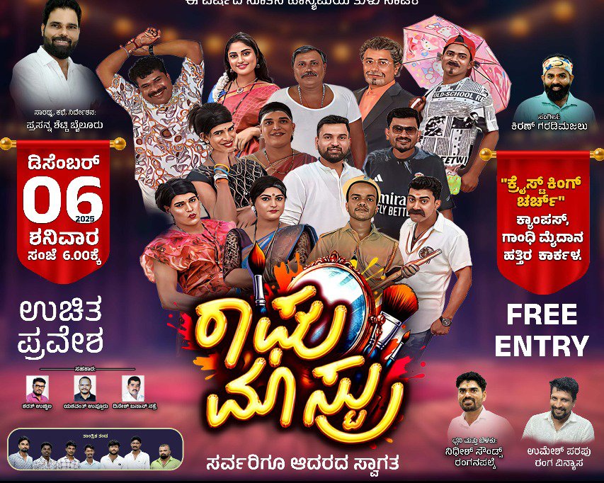ಚೈತನ್ಯ ಕಲಾವಿದರು ಬೈಲೂರು ತಂಡದ ಈ ವರ್ಷದ ಸೂಪರ್ ಹಿಟ್ ತುಳು ಹಾಸ್ಯಮಯ ನಾಟಕ ರಾಘು ಮಾಸ್ಟ್ರು ಇದರ ಉಚಿತ ಪ್ರದರ್ಶನವು ಕಾರ್ಕಳ ಗಾಂಧಿ ಮೈದಾನ ಬಳಿಯ ಕ್ರೈಸ್ಟ್ಕಿಂಗ್ ಚರ್ಚ್ ಕ್ಯಾಂಪಸ್ನಲ್ಲಿ ಡಿ. 06ರಂದು (ನಾಳೆ) ನಡೆಯಲಿದೆ.