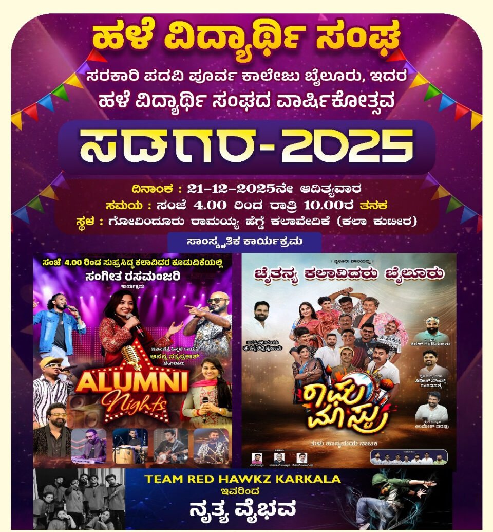 ಬೈಲೂರು:ಸರಕಾರಿ ಪದವಿ ಪೂರ್ವ ಕಾಲೇಜು ಬೈಲೂರು ಇದರ ಹಳೆ ವಿದ್ಯಾರ್ಥಿ ಸಂಘದ ವಾರ್ಷಿಕೋತ್ಸವ ‘ಸಡಗರ-2025’ ಡಿ. 21 ರಂದು ಸಂಜೆ 4.00ರಿಂದ ರಾತ್ರಿ 10.00ರವರೆಗೆ ಗೋವಿಂದೂರು ರಾಮಯ್ಯ ಹೆಗ್ಡೆ ಕಲಾವೀದಿಕೆ (ಕಲಾ ಕುಟೀರ)ಇಲ್ಲಿ ಜರಗಲಿದೆ.