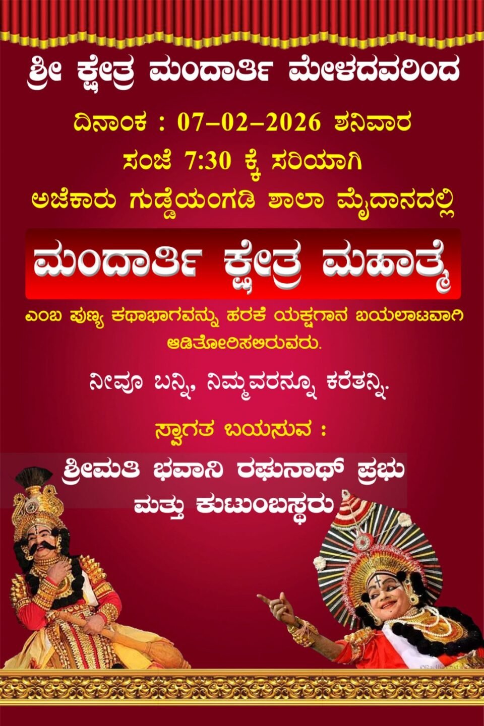 ಕಾರ್ಕಳಅಜೆಕಾರಿನಲ್ಲಿ ನಾಳೆ (ಫೆ. 07ರಂದು) ಮಂದಾರ್ತಿ ಕ್ಷೇತ್ರ ಮಹಾತ್ಮೆ ಯಕ್ಷಗಾನ by Madhyama BimbaFebruary 6, 20260353 Share0 Post Views: 235 ಅಜೆಕಾರು: ಅಜೆಕಾರು ಗುಡ್ಡೆಯಂಗಡಿ ಶಾಲಾ ಮೈದಾನದಲ್ಲಿ ಫೆ. 07 ರಂದು ಶನಿವಾರ ಸಂಜೆ 7.30 ರಿಂದ ಶ್ರೀ ಕ್ಷೇತ್ರ ಮಂದಾರ್ತಿ ಮೇಳದವರಿಂದ ‘ಮಂದಾರ್ತಿ ಕ್ಷೇತ್ರ ಮಹಾತ್ಮೆ’ ಹರಕೆ ಯಕ್ಷಗಾನ ಬಯಲಾಟ ಜರಗಲಿದೆ.