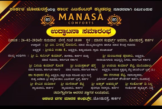 ಕಾರ್ಕಳ ಜೋಡುರಸ್ತೆಯಲ್ಲಿ ಕಾರ್ಲ ಸಿಟಿಸೆಂಟರ್ ಕಟ್ಟಡದಲ್ಲಿ ನೂತನವಾಗಿ ನಿರ್ಮಿಸಿರುವ ಮಾನಸ ಕಂಫರ್ಟ್ಸ್ (ನಾಳೆ) ಫೆ.26 ಗುರುವಾರದಂದು ಬೆಳಿಗ್ಗೆ 10.00 ಗಂಟೆಗೆ ಉದ್ಘಾಟನೆಗೊಳ್ಳಲಿದೆ.