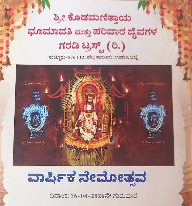 ಕುಚ್ಚೂರು ಶ್ರೀ ಕೊಡಮಣಿತ್ತಾಯ ಧೂಮಾವತಿ ಮತ್ತು ಪರಿವಾರ ದೈವಗಳ ಗರಡಿ ಟ್ರಸ್ಟ್ ವತಿಯಿಂದ ಕುಚ್ಚೂರು ಕೊಡಮಣಿತ್ತಾಯ ಮತ್ತು ಧೂಮಾವತಿ ಪರಿವಾರ ದೈವಗಳ ಕಾಲಂಪ್ರತಿಯ ಸಂಪ್ರದಾಯದಂತೆ ನಡೆಯುವ ವಾರ್ಷಿಕ ನೇಮೋತ್ಸವವು ಏ. 16ರಂದು ನಡೆಯಲಿದೆ.